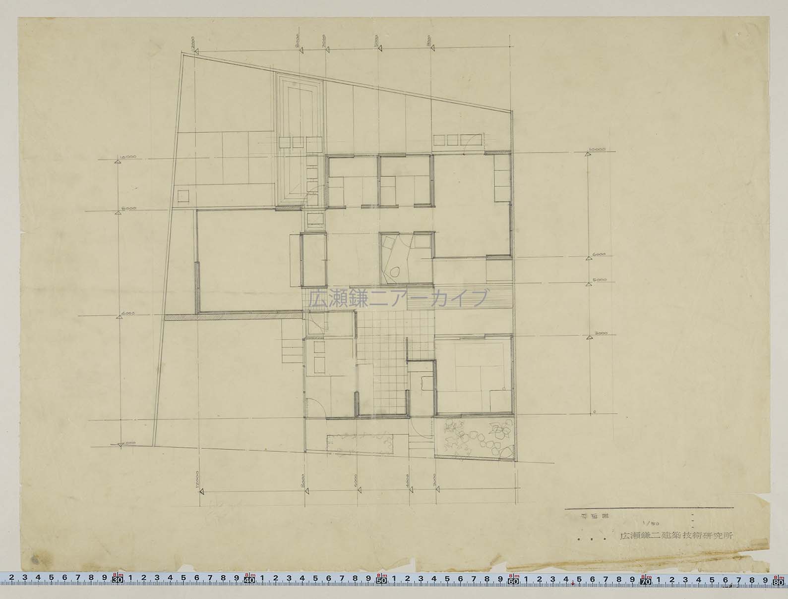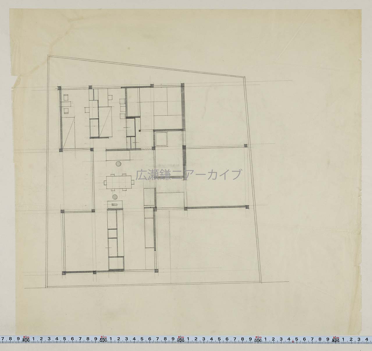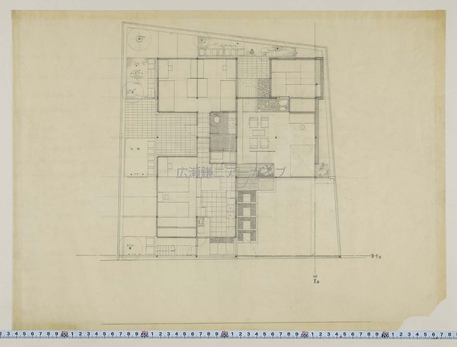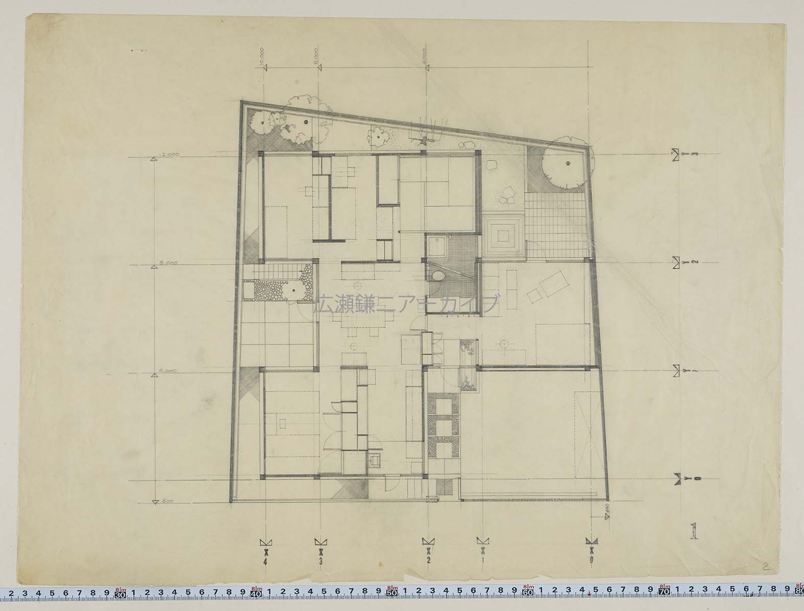 スペースユニットは居間、食堂、台所、和室、浴室・便所、子供室A・ B、寝室で、このスペースユニットの間に廊下、玄関、納戸、機械室や庭からの池が貫入したりしている。