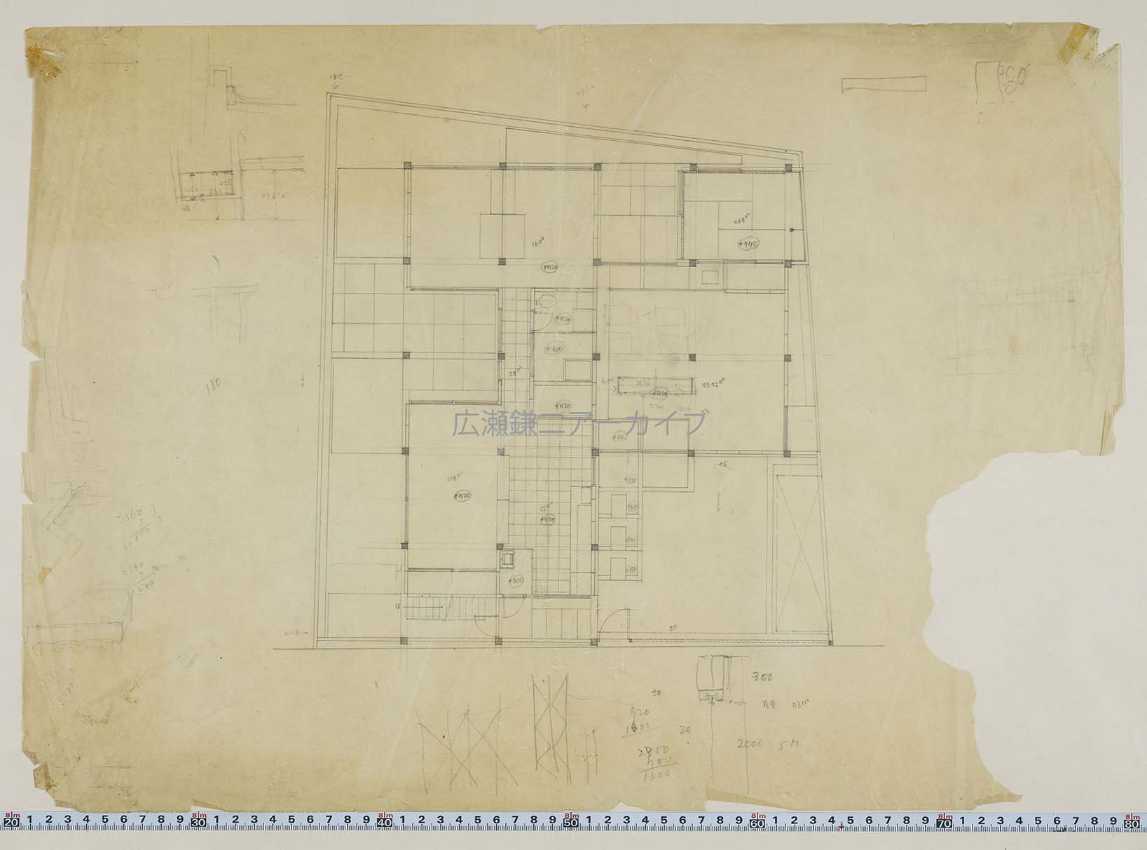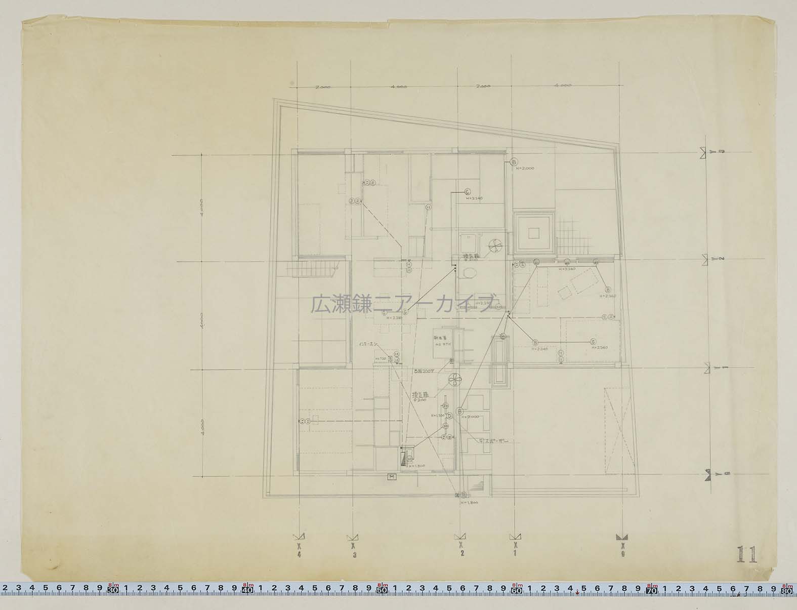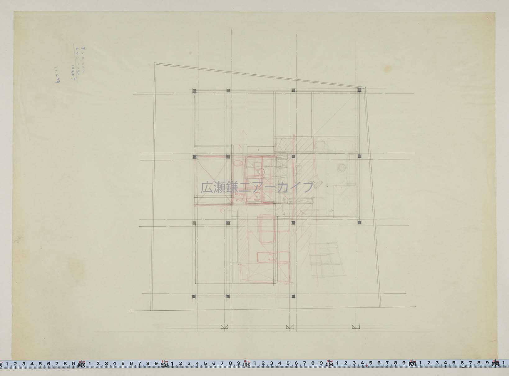 スペースユニットは居間、食堂、台所、和室、浴室・便所、子供室A・ B、寝室で、このスペースユニットの間に廊下、玄関、納戸、機械室や庭からの池が貫入したりしている。
